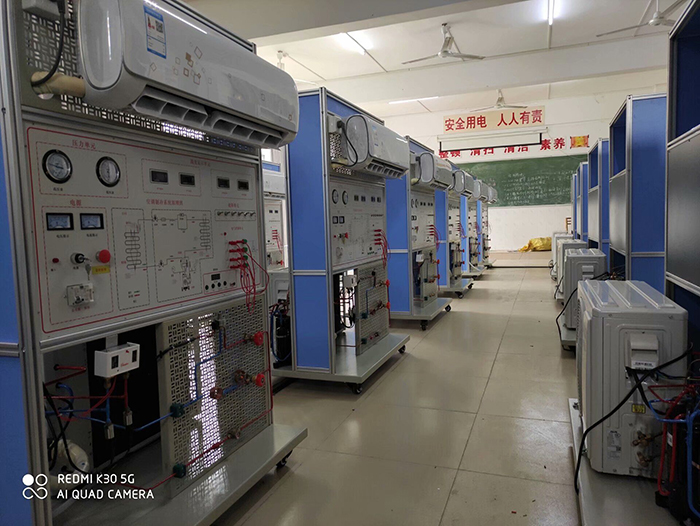 5、设有电流型漏电保护装置;并有热保护器件,对压缩机进行过热、过载保护;实训强电连接导线及插座采用手枪插式全封闭结构,使用方便、可靠、防触电