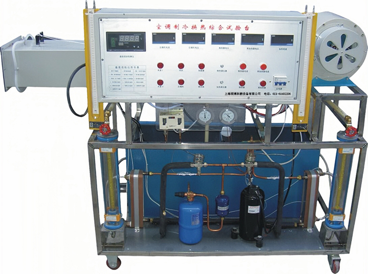 二、功能:空调制冷换热综合实验装置集直流空调,制冷压缩机性能,制冷热泵,表冷器性能,加热器性能于一体,可进行空气的加热,加湿,冷却,干燥,蒸发器,冷凝器进行换相,可测各点温度、湿度、压力、风量、水流量及功率。