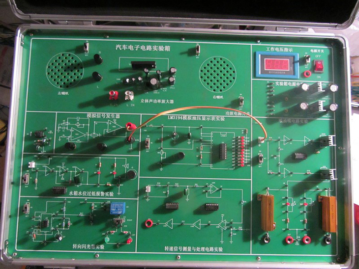 汽车电子电路实验箱结合汽车电学的典型基本电路,由浅到深地设计了二极管和三极管基本实验、线性集成稳压电源实验、喷油器驱动实验、转速信号测量与处理实验、水箱水位过低报警实验、转向闪光器实验等六个实验项目,提供了一个给学生提高动手能力,深入理解汽车电学基础知识的实验平台。