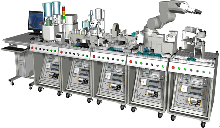 机电一体化综合实训考核系统是基于国家中长期人才发展规划纲要,对经济社会发展重点领域急需紧缺专门人才培养的需要,依据国家相关职业工种培养及鉴定标准,结合中国当前制造业的岗位需求设计研发。机电一体化综合实训考核系统由"工作站"形式综合体现,"工作站"包含机电一体化"工作岛",电气装配台,机械装配台,工具、资料柜及其他附属工作设施,不但让操作者在工作中实习训练了机电专业技能,同时也体验到职业素养中的社会能力与方法能力。"工作站"的核心是"工作岛",由MPS模块化生产线设备组成,共分为液体混合灌装、组装加工、检测判别、机器人和智能仓储五个工作岛设备组成,工作岛由PLC、变频器、伺服驱动、步进驱动、气动元件、触摸屏等工业控制器件构成,操作者需要具备机械装调、电气管路连接、程序设计、机器人操作、传感器装调、检修排故、触摸屏组态等现代制造业岗位必要的技能,设备技术涵盖面广,定位具有前瞻性,是机电一体化专业教学实习、技能鉴定和技能竞赛的绝佳载体。