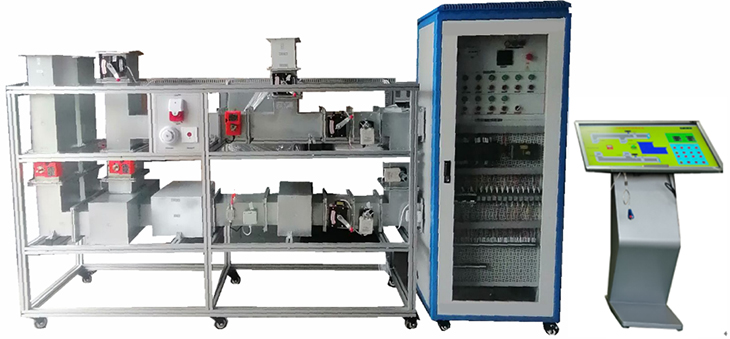 装置心4040铝材为主体框架,尺寸:长2500MM*宽500MM*高2000MM,框架内包含新风井(模拟)、排风井(模拟)、新风机、回/排风机、排烟风机、电动调节阀、电动排烟防火阀、自动防烟防火阀、通风管路、相关传感器以及就地控制柜等。充分地展示了空调通风(防排烟)系统结构形式、控制原理。系统主要组成由下面几个部分组成