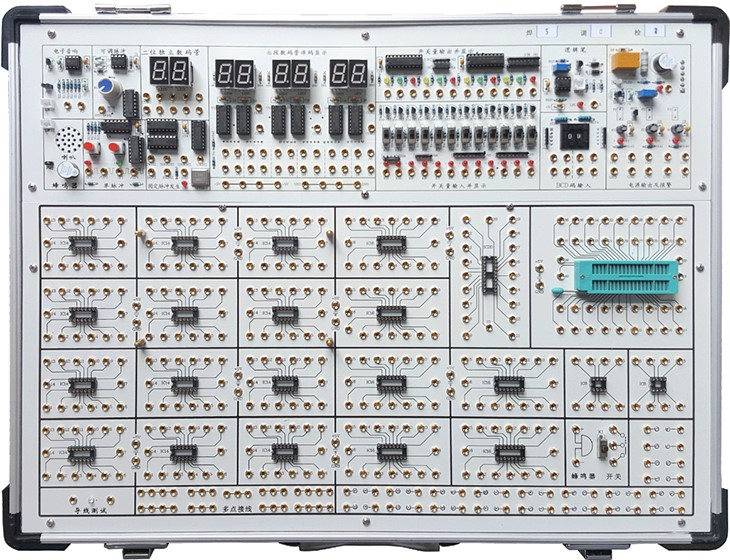 数字电路实验箱,数字电路实验室,数字逻辑实验箱、数字电路实验装置、主要用于开设电子信息科学与技术、自动化和机电一体化三个专业的《数字电子技术实验》或《数字电子技术基础实验》课程,该课程是相应的《数字电子技术》或《数字电子技术基础》理论课程中重要的实践环节。课程的任务是通过实验,使学生加深对所学理论课程内容的理解,激发学习兴趣,从实践上验证所学的理论知识;培养学生的实际动手能力、解决问题能力和设计数字电子电路的初步能力。数字电路实验箱由铝木合金箱体、开关电源、常用信号源和实验电路区组成。其中实验电路区采用全开放模式,可根据需求灵活配置实验电路,以满足不同层次学生的教学实验要求。