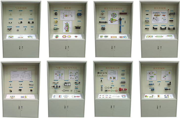 气动液压陈列柜,气动液压示教陈列柜,透明液压PLC控制实训台、气动PLC控制实训台、智能化液压伺服控制系统实验装置、挖掘机液压系统实训装置、液压元件拆装实训台是《液压与气压传动》课程的实验场所,承担机械控制及其自动化、船舶与海洋工程、电气工程及