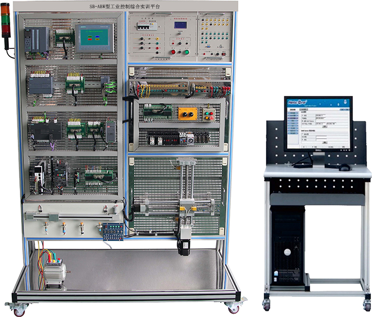 实训装置AB主机单元、西门子主机单元、变频调速单元、小车运动控制单元、实训组件、电工基础实训单元二维丝杆控制单元、触摸屏单元、以太网交换机、交流电机等组成。