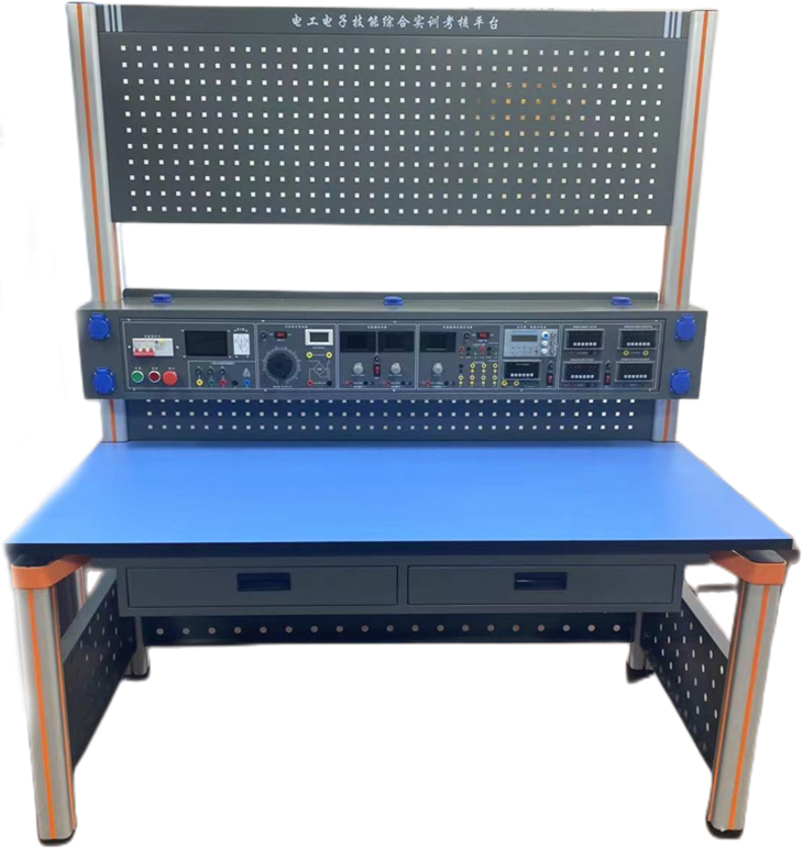 电工电子技能综合实训装置由实验主机箱、仪器架、实训桌、移动矮柜、电工电子实训套件、学生凳等组成。实验装置支架与实验桌可组合、可拆装。支架与桌脚一体,铝合金结构。