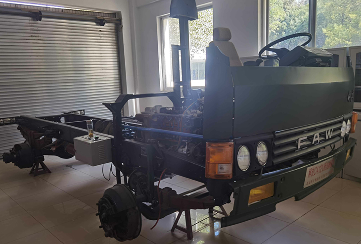东风天锦EQ1120GA2底盘实训设备采用东风天锦EQ1120GA2型运兵车底盘各系统(拆卸车外壳)为基础,充分展示汽车底盘各系统的组成结构。包括汽车前后悬挂系、转向系、传动系、手动变速器及挂档机构、制动系等系统、安装脚轮的可移动式台架等组成。
