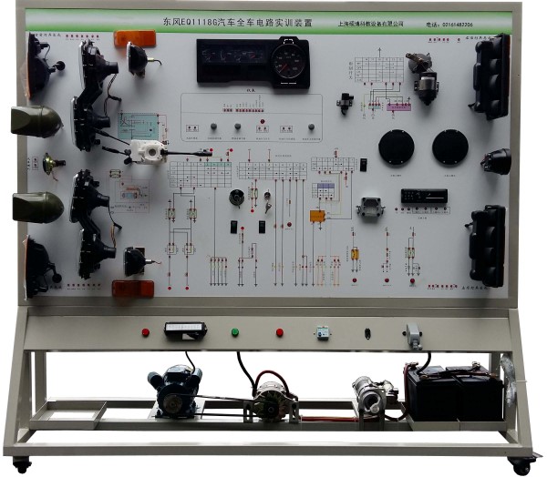 全车电器实训台以东风EQ1118柴油机全车电器实物为基础,展示灯光系统、仪表系统、发动机预热系统、起动系统、充电系统、喇叭系统、雨刮系统的组成结构和工作原理及过程。适用于中高等职业技术院校及普通教育类学院和培训机构对汽车全车电器系统的理论和维修实训的教学需要。