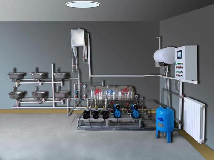 1、生活给水系统:主要有给水箱、给水泵、给水管道、压力变送器、脉冲水表、水龙头和淋浴头等组成。管路采用不锈钢管进行设计,可进行不锈钢管的切割、安装和通水试验操作,通过控制系统可实现生活给水系统的变频恒压供水功能,实现单泵变频控制或双泵切换控制等功能;通过脉冲式水表可以完成用水量的计量。