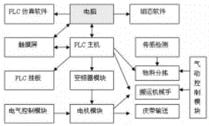 光机电一体化实训装置由型材导轨式实训台,典型机电一体化设备机械部件,PLC模块,变频器模块,按钮模块,电源模块,低压电器模块,模拟生产设备实训模块(包含上料机构,搬运机械手,皮带输送线,物件分拣等)接线端子排,各种传感器,警示灯和气动电磁阀等组成。整体结构采用开放式和拆装式设计,学生可以组装,接线,编程和调试由上料机构,搬运机械手机构,皮带输送线和物料分拣组成的光机电一体化设备。装置的总体结构示意图如图主所示。