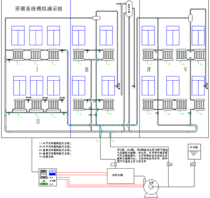 2、18个玻璃暖气包,5种采暖方式模拟多种形式热水采暖系统工作过程及其连接方式。