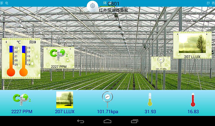 3、环境检测系统:通过二氧化碳传感器、大气压力传感器、光照强度传感器、温湿度传感器,配合智能网关环境检测系统软件,实现农业大棚环境检测系统等物联网综合应用系统。