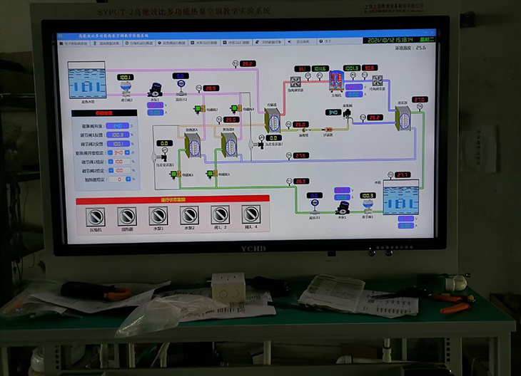 *1450寸高精度触摸屏一体机及控制开发软件,可进行教学演示和实验模式控制,并实时显示系统温度、压力、差压、流量、功率等数据,计算系统能效比和制热量等参数。
