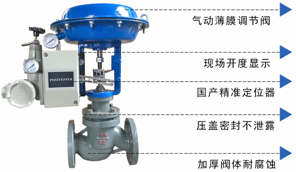 2、阀体按流体力学原理设计成等截面低流阻流道,可调范围大,固有可调比为50,额定流量系数增大30%。