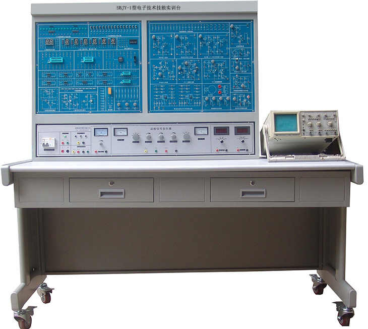 电子技术技能实训台,电子技术综合实训平台,该设备是根据职业院校培训教材《模拟电子技术》、《数字电子技术》等课程的教学实训要求开发设计的。设备采用开放式的平台式设计模式,提供了外插式电阻、电容、二极管、三极管、电位器、集成块等电子器件及数字式电压、电流测量仪表,适用于各职业院校、中等专业学校、技工院校等进行数电、模电等课程的教学实训。