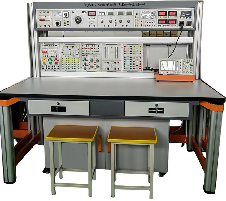 电子电路技术综合实训装置由主机箱、实验桌、实训挂箱、独立封装实训电路模块、移动矮柜、示波器架、学生凳等组成。实训装置支架与实训桌可组合、可拆装。支架与桌脚一体,铝合金结构,实训挂箱、各实验模块可根据实验需求自由组合放置。