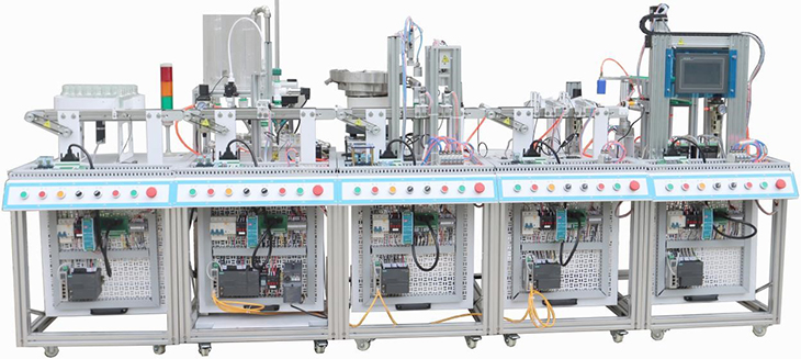 1.模拟工业药剂生产装配流程,共包含5个工作站,可单站、可组合灵活搭配;模块化的设计,可以模块装调,位置灵活调整,每站各有一套PLC控制系统独立控制,在单个培训完成以后,又可以将相邻的两站连在一起,学习复杂系统的设计、安装、编程、调试和整机运行。