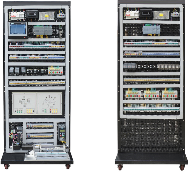 工业自动化网络控制实验实训平台(双面)工作台以网孔架为基础实训单元,仿真企业真实环境,可开展PLC系统基础模块连接实训。该工作台采用A,B双面实训方式,其中A工作面为西门子S7-200SMARTPLC实训区,该实训区由电源单元、PLC单元、PLC学习箱单元、基础实训单元、扩展实训区(伺服控制小车运动实训单元、步进电机单元和变频器单元)六大部分组成。B工作面为西门子S7-1200PLC实训区,主要分为电源单元、PLC单元、基础实训单元三部分组成。