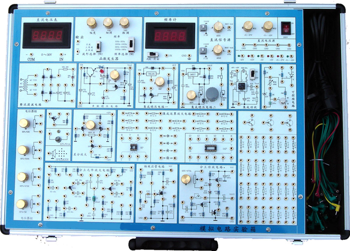 模拟电路实验箱是根据最新的《高等工业学校电子技术基础》教学大纲中确定的教学实验要求为基础,汲取了众多专业教师的教学经验,并综合了众多同类产品的优点而设计的。它函盖了《模拟电子技术基础》课程全部实验内容,既为初学者提供了验证性实验电路,又为课程设计提供了扩展平台。
