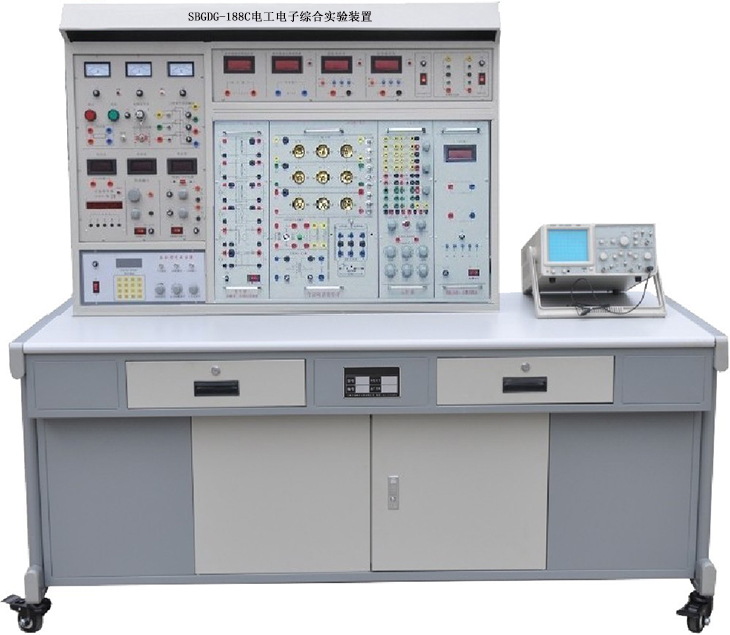 电子电工综合实验装置,用于完成电子电工基础实验。电工电子综合实验设备能满足各类电工学、电工技术和电子技术课程的实验要求,配备有实验屏、实验桌和若干实验组件挂箱子等组成。工作电源为三相五线,工作电力为380V。拥有控制及交流电源部分、直流电源部分、功率斩俞出函数发生器等。配有实训连核线。