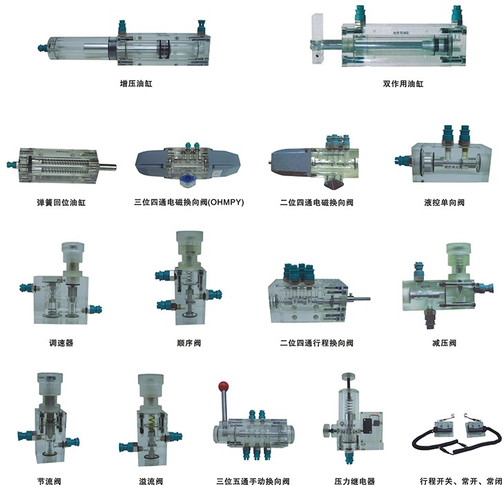 8、液压元件:采用透明工艺加工而成,最大工作压力2.0MPa。每个透明液压元件皆配有底板,可方便、随意地安放在操作面板上。油路搭接采用快换接头,而且采用透明软管,可清晰直观看见油路的流动,不漏油。