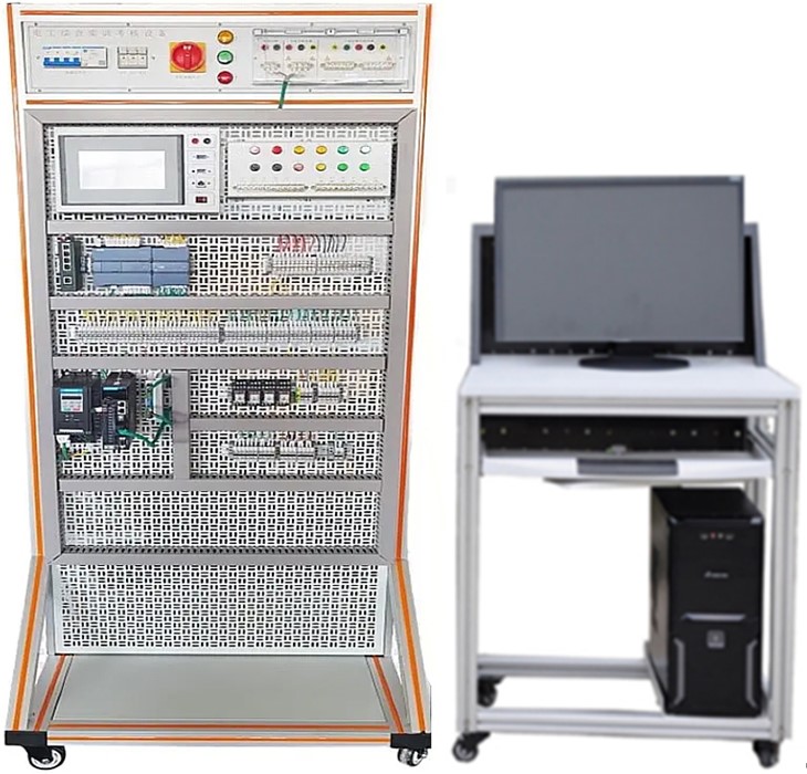 电气控制与PLC综合实训装置、电气控制实训装置,电子电气工控实训台,PLC可编程控制器,电动机等。要求学生根据题目自己设计实验方案、准备相关材料、动手操作并记录实验实训结果,培养学生掌握电气技术,PLC技术,各种低压电器和自动化设备的安装、调试、维护技能。