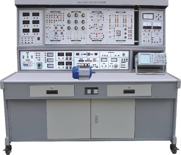 电工电子实验装置具有较完善的安全保护措施,较齐全的功能。电工、电气控制实验器件采用适应性强的模块式挂箱;在实验屏上完成实验,实验方法灵活,动手能力强,实验连线接点接触可靠,符合不同深度,不同广度的教学要求。数电、模电在九孔通用电路板挂箱上完成,根据实验复杂程度选取挂箱个数,根据实验电路在通用电路板上拼插实验电路,实验元件制成透明创新模块,直观性好,盒盖印有永不褪色元件符号,线条清晰美观。盒体与盒盖结合采用较科学的压卡式结构,维修、更换元件拆装方便。该实验台结构合理,学校可随时按需要增添新的模块挂箱,灵活、经济。