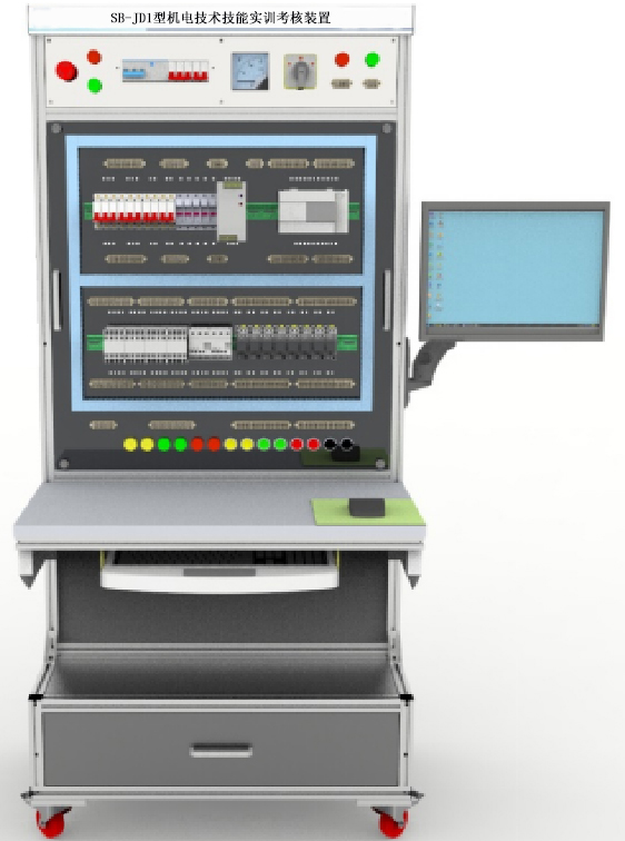 机电技术技能实训考核装置,由电源控制屏、电机控制单元模块、家用配电单元模块、PLC单元模块、三相异步电动机、计算机(可选)、常用电工工具等构成,适用于以下专业相关技能模块的实训及考核: