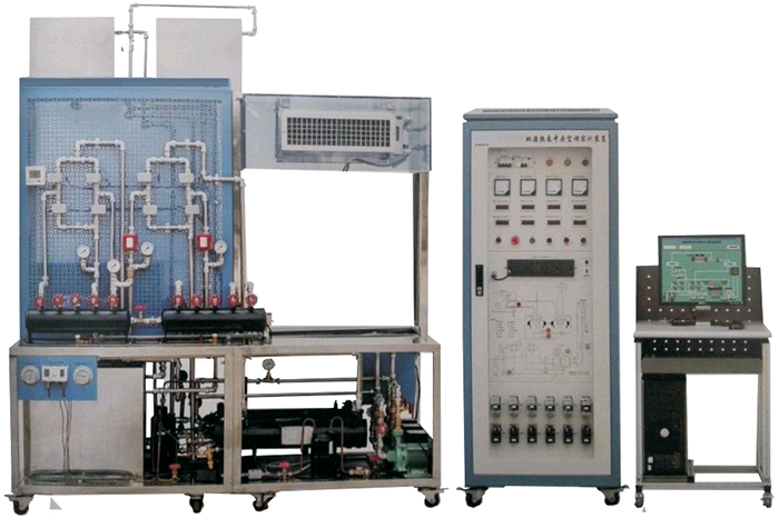 地源热泵空调系统由制冷机组、模拟水井、空调系统、生活卫生供水系统、控制系统、实训台等组成。实训台采用不锈钢底架结构,结构坚固,造型美观大方;桌面用于安装电源控制屏并提供一个宽敞舒适的工作台面。