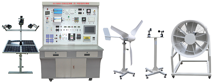 系统装置由太阳能光伏电板、双轴跟踪控制模块、蓄电池模块、太阳能控制器模块、太阳能逆变器模块、模拟风洞发电模块、开关控制模块、环境监测模块、上位机监控模块,仪表显示部分,(各功能转换接口模块)等组成;各控制系统集成于风能发电、光伏发电为一体的教学实训台;各系统通过连接电缆进行连接,形成一套可完成风力及光伏发电、同步并网、离网电源的实验及教学演示。帮助学生理解太阳能并网、离网及风力发电系统的原理,从而起到学习工程实际应用技能的作用。