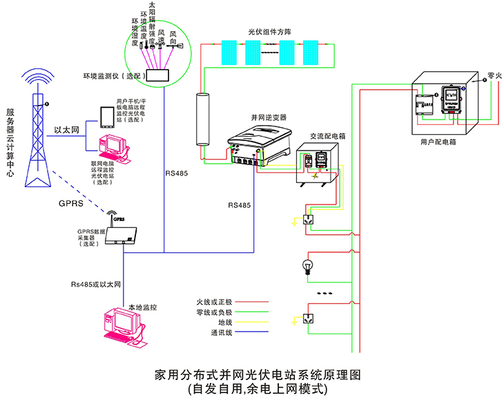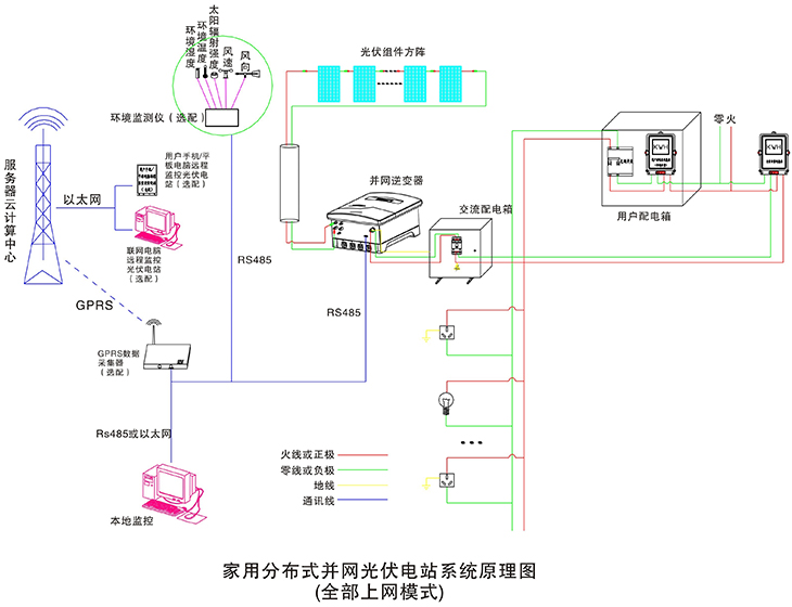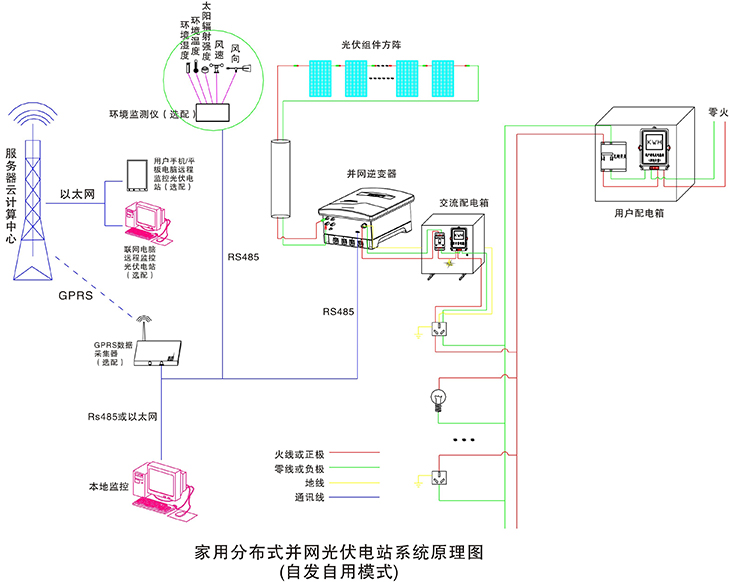 在晴朗的白天,装在屋顶上的光伏组件发出的直流电经过并网逆变器逆变成与电网同频率同相位的单相交流电给负载进行供电,在夜晚或阴雨天等太阳光照不足的情况下,系统处于待机状态,负载用电全部来自电网。您可以通过系统监控软件来实时查看系统的运行状态和故障信息,或者是选配远程通讯数据采集器,将系统工作数据通过GPRS或以太网,传输到您的手机、平板电脑或任意一台联网的电脑,以便于您远程实时掌控电站的信息。