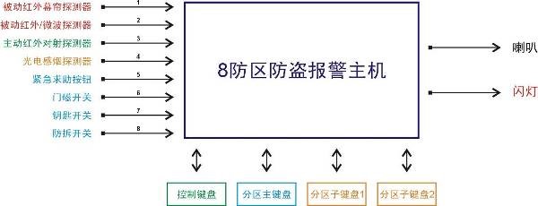 用户与报警系统间的通讯界面。用户可通过键盘发布指令;键盘则在用户的整个操作过程中提供可视显示和有声提示。带标有数字的防区指示灯,用于显示各个防区的状态 |