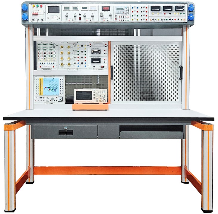 五、实训操作桌:铁质双层亚光密纹喷塑,桌面为防火、防水、耐磨高密度板,设有抽屉和元件储存柜,结构坚固、造型美观大方。
