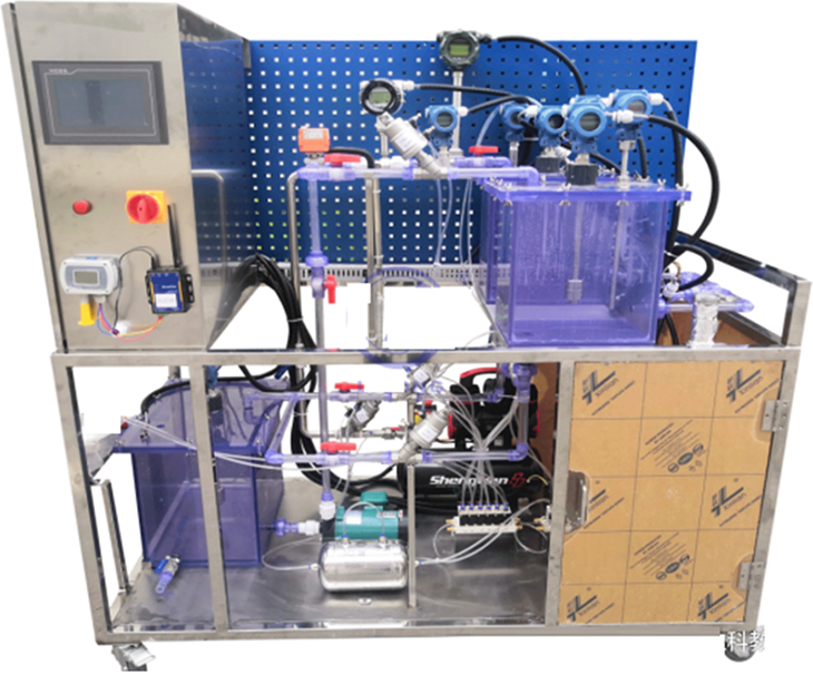 实训台以水、气/汽、电能耗监测为背景,采用液位计、流量计、温度变送器、压力变送器、电磁阀、水泵、气泵、电气控制箱、水箱等装置模拟工业场景下的水循环、气循环、电能监测常见的过程控制系统。其中水箱作为液体盛放和气体导入的气液混合容器,模拟化工行业常见的化工产品制备工艺场景。通过现场监控装置及传输模块,将液位、流量、压力、水温、气温、电压、电流、电量等过程控制参数进行数据采集,传输到能源管理平台,达到工业水、汽、气、电等至少三种数据采集控制、数据传输、数据存储、数据分析及可视化展示的目的。