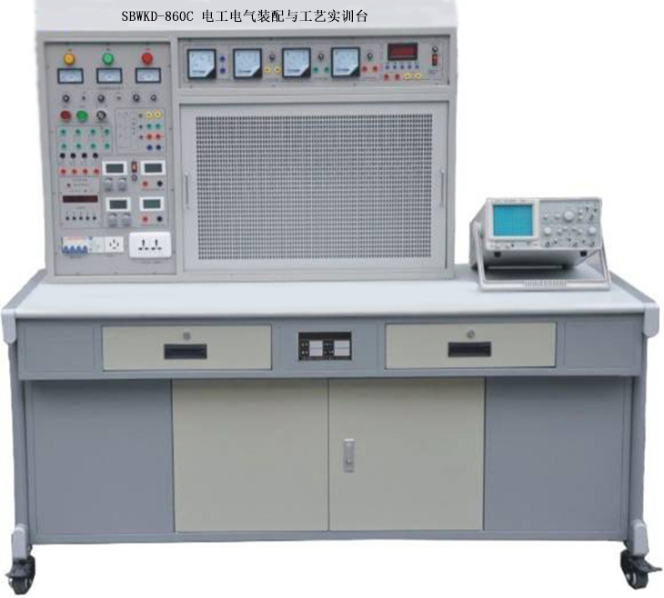四、实训操作桌:铁质双层亚光密纹喷塑,桌面为防火、防水、耐磨高密度板,设有抽屉和元件储存柜,结构坚固、造型美观大方。