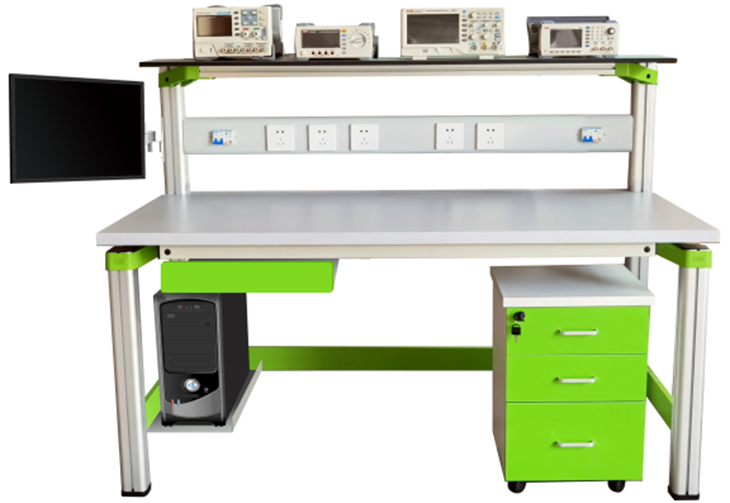 实训桌规格为1400(长)*700(宽)*1150(高),设有一个键盘托一个抽屉,桌子下部靠后右边有一个电脑主机箱托。实验桌主体结构全部采用高性能表面氧化的铝型材及一次成型铝压铸框架连接构件,连接构件采用压铸成型工艺(非焊接工艺),经机加工、抛丸、喷砂,表面静电喷涂工艺,安装方便、快捷,用户可自行DIY组装。桌体立柱采用工业铝型材成型工艺,表面氧化处理,截面尺寸:70mm×70mm,四面带槽,槽宽约8mm,端部装有注塑成型配套塑料堵头。桌面采用25mmE1级三聚氰胺饰面板,桌面板下设支撑框架,承受力不少于300kg。配备储存柜,存放元件及工具,储存柜底部4只高强度万向可制动PU脚轮,方便移动。实训装置整体简约不简单,高端大气,符合现代化产品审美和发展趋势。