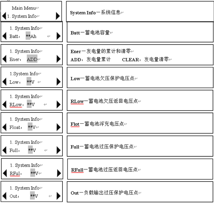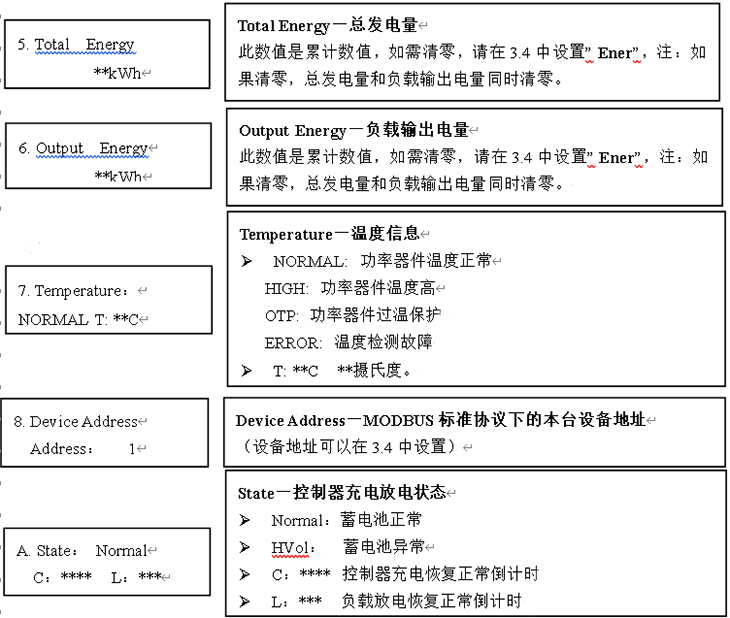 ⑥显示光伏发电系统的 各种工作状态,包括:蓄电池(组)电压、负载状态、电池方阵工作状态、辅助电源状态、 环境温度状态、故障报警等。