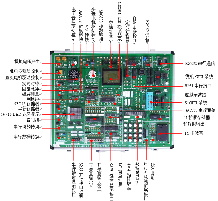 集成一体化单片机、微机接口综合实验箱综合51单片机系统和8088微机原理接口系统为一体化设计的实验平台,根据单片机和微机接口实验教学的特点出发,全部系统和实验模块采用一体化设计方式,该实验系统是目前最实用的一款单片机和微机接口综合实验教学平台,适合各层次学生进行单片机原理和应用方面的实验教学。主要元器件采用直插式焊接工艺,插线孔采用通孔,防止异物进入孔内后造成插孔堵塞后不易清理。
