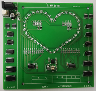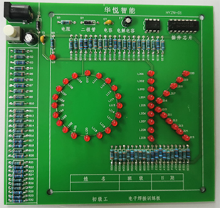 初级功能训练板:主要是满足插件元器件焊接的教学训练。教学生认识插件电阻、插件二极管、插件无极性电容、电解电容图标以及插件芯片等焊接。电阻选用1/8W,1/4W两种常规格的设计焊盘,并设计较疏、一般、较密三种焊盘间距。LED焊接采用3和?5两种脚距形成'OK'字样。初级功能训练板焊接主要教会学生直插元器件认知、元器件整形、插件、焊接等技能。也可以教学生学习电阻色环标识。