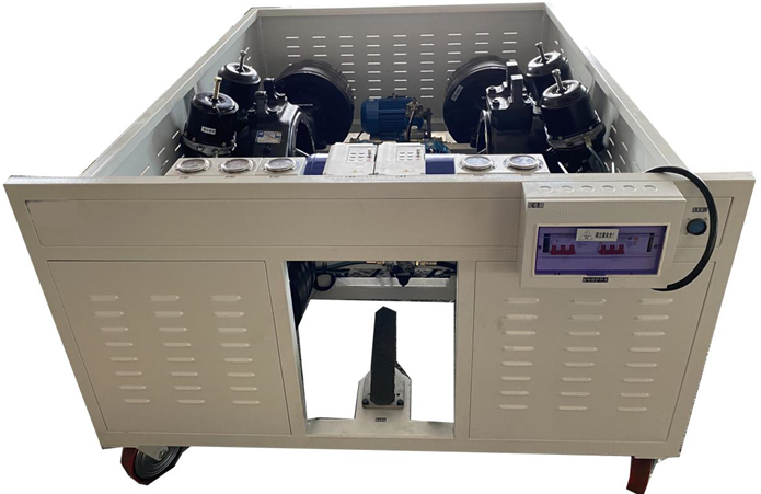 2.由三相异步电动机带动前后轴转动,模拟汽车行驶。紧急踩下制动踏板时,ABS系统开始工作,前后制动盘保持微量转动,制动踏板上可感觉不断弹脚,真实演示气压ABS系统的工作过程。