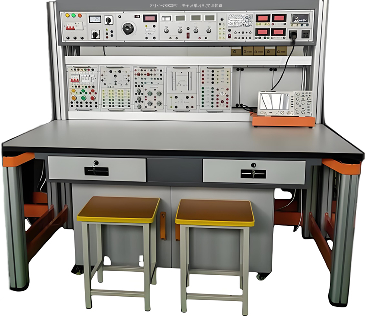 装置由主机箱、实验桌、实训挂箱、独立封装实训电路模块、移动矮柜、示波器架、学生凳等组成。实训装置支架与实训桌可组合、可拆装。支架与桌脚一体,铝合金结构,实训挂箱、各实验模块可根据实验需求自由组合放置。