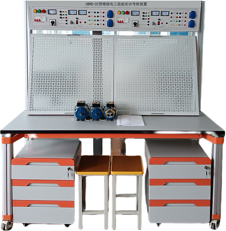 电工基本技能综合考核实训台由实训屏(内置电源)、实训桌、实训储物柜三大部分组成。