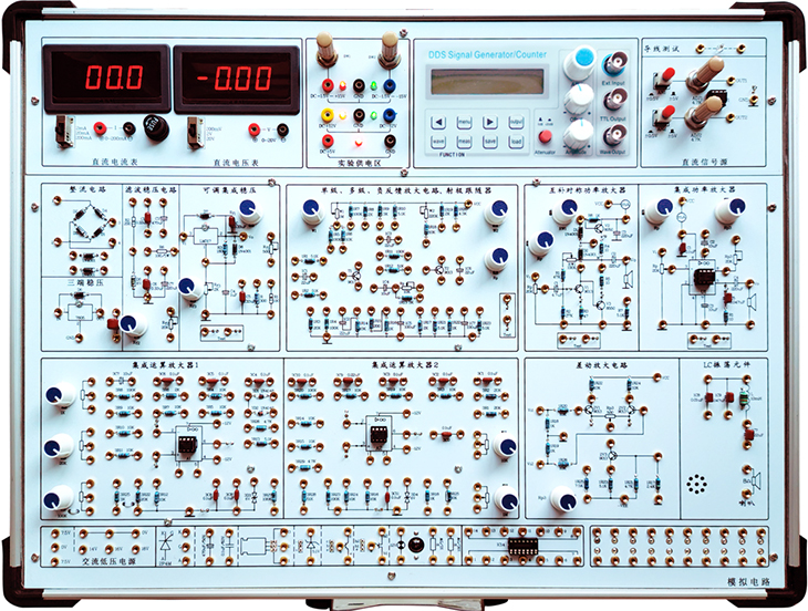 含机箱、工作电源、常用模拟信号源、实验电路区和分立元件