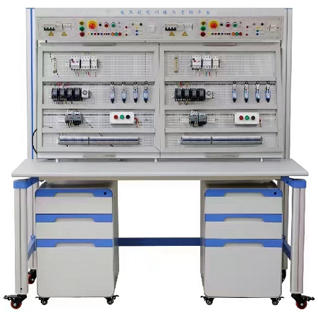 本实训台由实训屏(内置电源)、实训桌、实训储物柜三大部分组成。