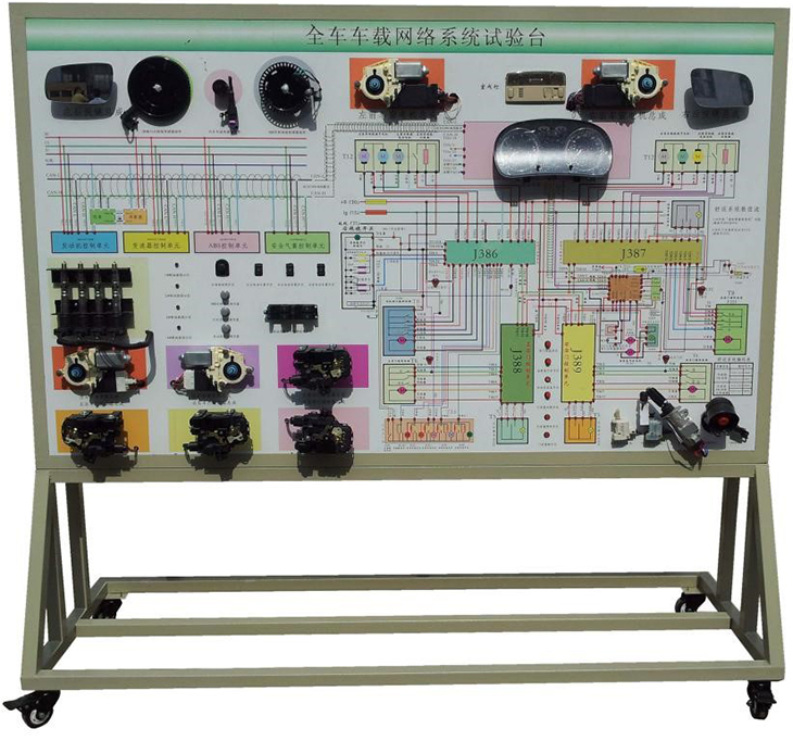 2.示教板面板采用耐撞击、耐污染、防火、防潮的高级铝塑板,表面经特殊工艺喷涂底漆处理;面板打印有永不褪色的彩色电路图;学员可直观对照电路图和实物,认识和分析车载网络系统的工作原理。
