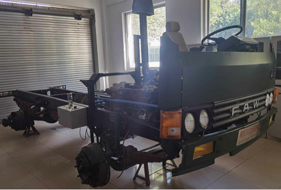 该设备采用东风天锦EQ1120GA2型运兵车底盘各系统(拆卸车外壳)为基础,充分展示汽车底盘各系统的组成结构。包括汽车前后悬挂系、转向系、传动系、手动变速器及挂档机构、制动系等系统、安装脚轮的可移动式台架等组成。