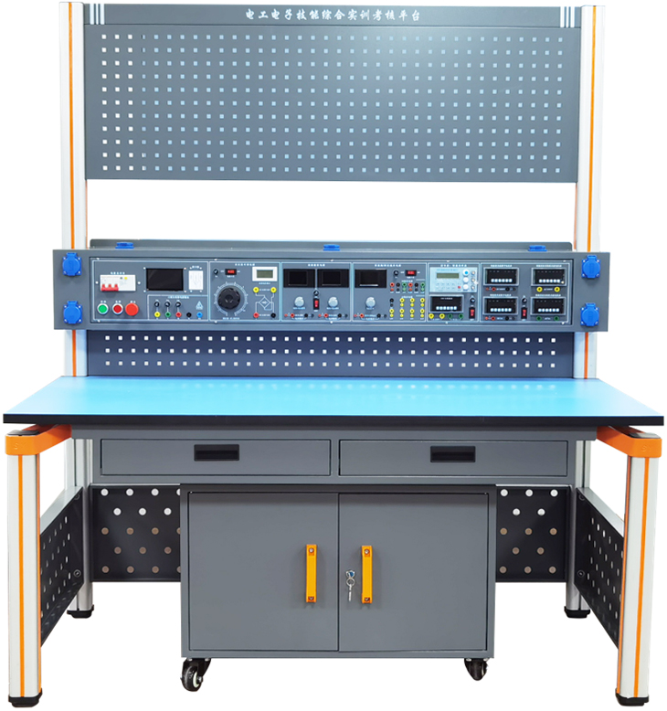 电工电子技能综合实训装置由实验主机箱、仪器架、实训桌、移动矮柜、电工电子实训套件、学生凳等组成。实验装置支架与实验桌可组合、可拆装。支架与桌脚一体,铝合金结构。
