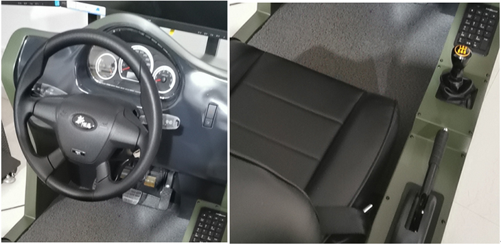 2)开放式舱体,方向盘、变速机构、手制动、加油踏板、制动踏板、离合器踏板等实装主要操作部件均需要模拟,其外观尺寸、部署相对位置、操作行程,以及操作力度感受与实际基本一致,操纵机件性能工作可靠、操作灵活、低噪音。