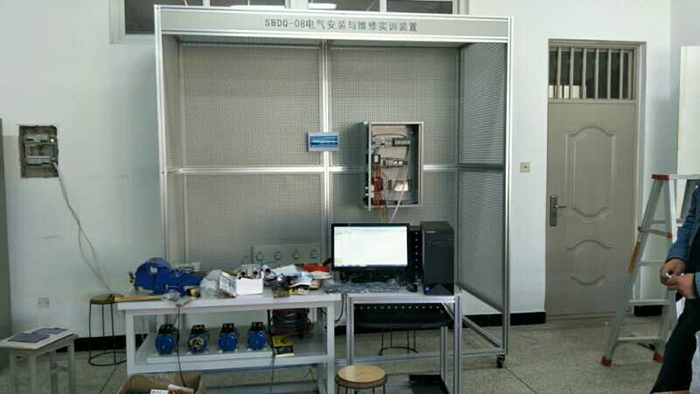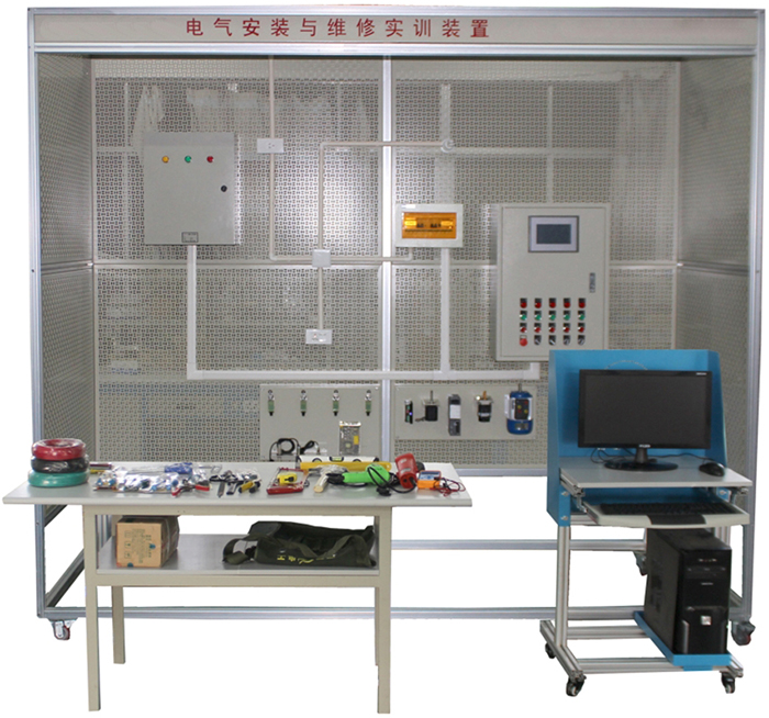 电气安装与维修调试实训平台可进行电工安装。如桥架安装、PVC管安装、吊灯、白炽灯座、日光灯、开关、插座、配电箱、控制箱等,装置还包含有交流异步电动机、直流电动机、步进电机、伺服电机、温度控制器、电偶、PLC、变频器触摸屏、消防联动、防盗报警、视频监控等控制与受控对象。该系统每个操作组配套一可移动式工具车和元件柜,便于对元件的保管和安装施工。从根本上解决了学校在普通墙面上进行的安装培训的使用不方便、实训范围窄的问题。