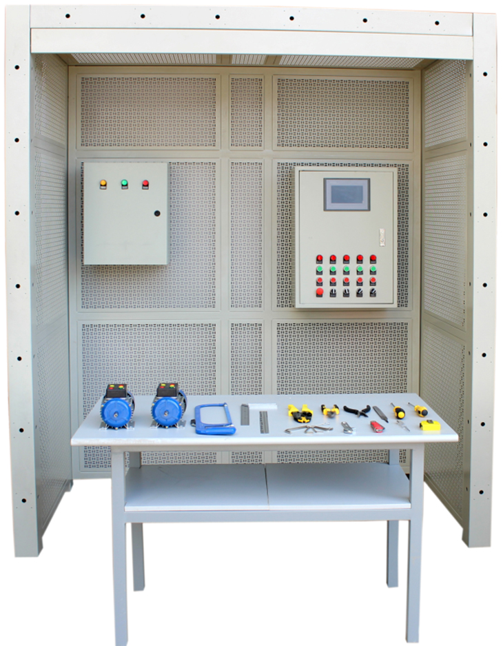 本设备可进行电工安装。如桥架安装、PVC管安装、吊灯、白炽灯座、日光灯、开关、插座、配电箱、控制箱等,装置还包含有交流异步电动机、直流电动机、步进电机、伺服电机、温度控制器、电偶、PLC、变频器触摸屏、消防联动、防盗报警、视频监控等控制与受控对象。该系统每个操作组配套一可移动式工具车和元件柜,便于对元件的保管和安装施工。从根本上解决了学校在普通墙面上进行的安装培训的使用不方便、实训范围窄的问题