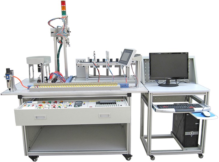 光机电一体化实训考核装置由铝合金导轨式实训台、典型的机电一体化设备的机械部件、PLC模块、变频器模块、按钮模块、电源模块、模拟生产设备实训模块、接线端子排和各种传感器、计算机等组成。整体结构采用开放式和拆装式,机电一体化实训装置用于机械部件组装,可根据现有的机械部件组装生产设备,也可添加机械部件组装其他生产设备,使整个装置能够灵活的按教学或竞赛要求组装具有生产功能的机电一体化设备。模块采用标准结构和抽屉式模块放置架,互换性强;按具有生产性功能和整合学习功能的原则确定模块内容,使教学或竞赛时可方便的选择需要的模块。设备需完全符合电工电子全国职业技能大赛所要求,同时还要求具有可拓展功能,可以组成更加大型的生产模拟系统,以配合各个用户学校不同层次,不同专业的教学及培训要求。